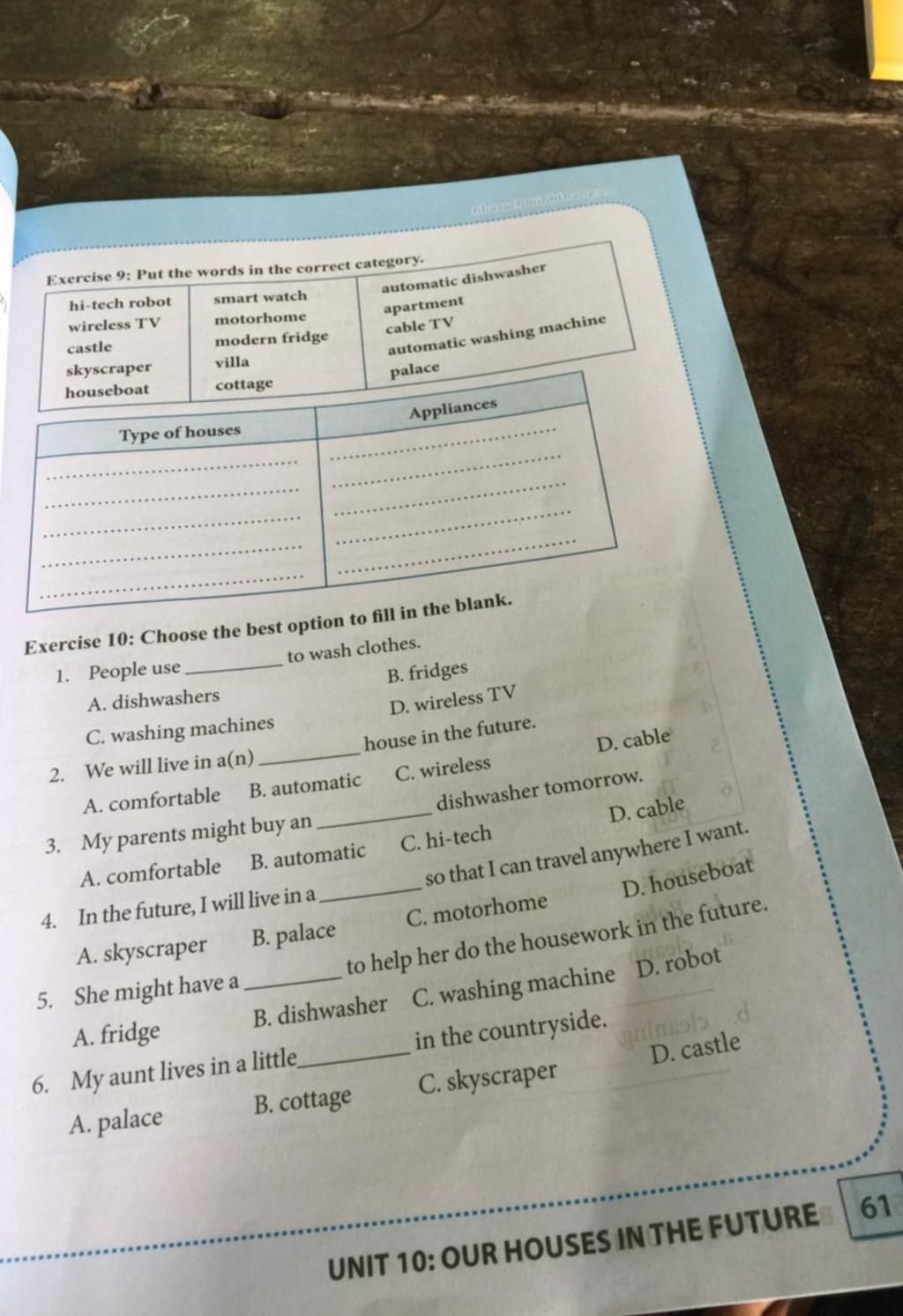-Appliances: hi-tech robot, wireless TV, smartwatch, modern fridge, automatic dishwasher, cable TV, automatic washing machine.