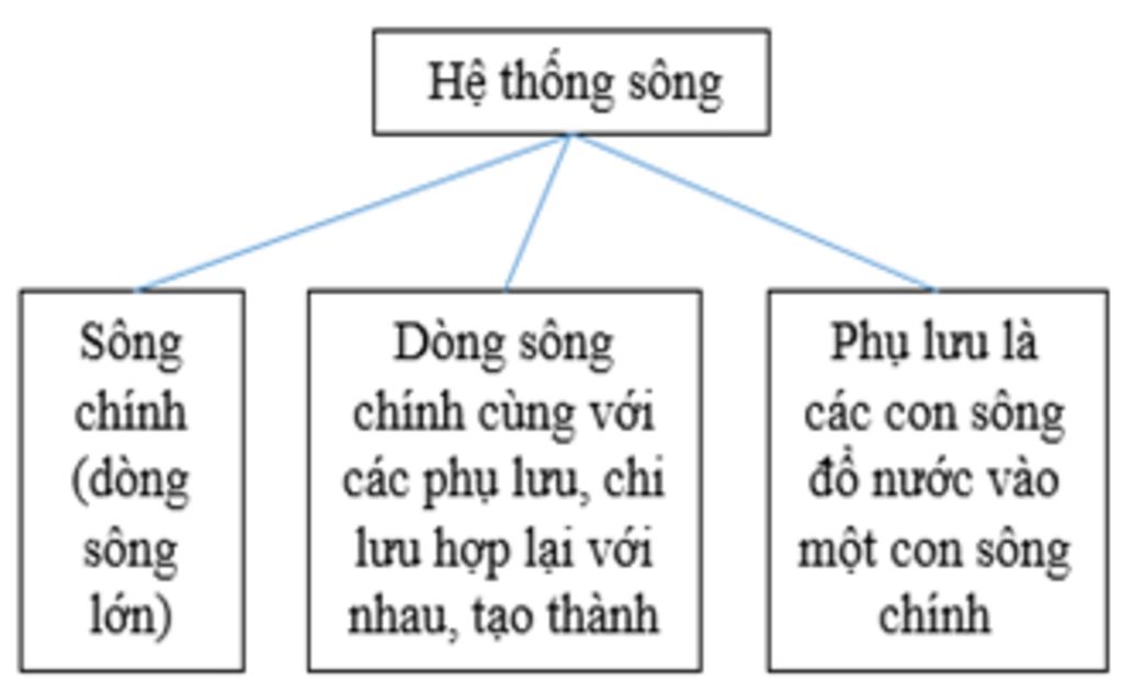 - Hệ thống sông là một mạng lưới các con sông nhỏ hợp thành cung cấp nước cho con sông chính. Bao gồm: phụ lưu (cung cấp nước cho sông chính), sông chính và chi lưu (từ sông chính đổ ra sông khác hoặc đổ ra biển).