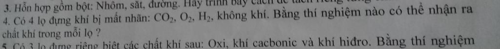 Đề hỏi là: có 4 lọ đựng khí mất nhãn:CO2, O2 ,H2, không khí.Bă ̀ng thí nghiệm nào có thể nhận ra chất. Khí trong mỗi lọ? Mà