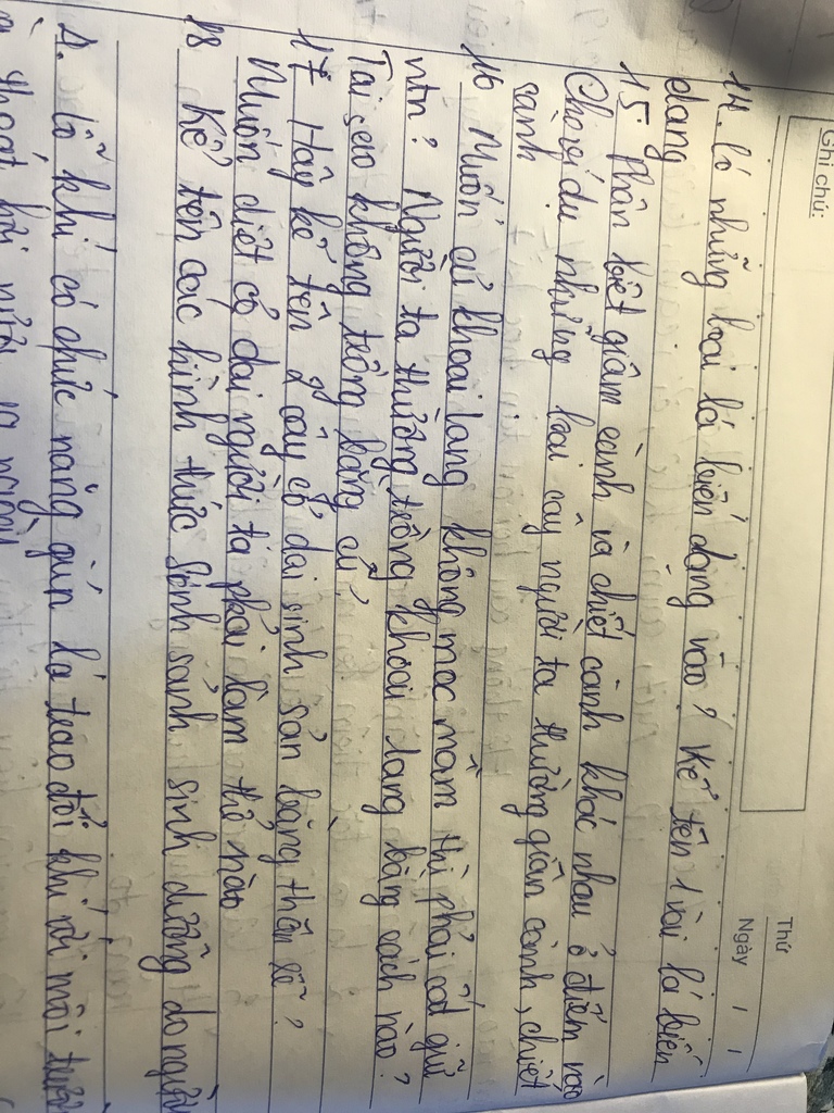 Câu 1: có các loại lá biến dạng là: lá biến thành gai, lá biến thành tua cuốn, tay móc, lá vảy, lá dự trữ chất hữu cơ, lá bắt mồi,...