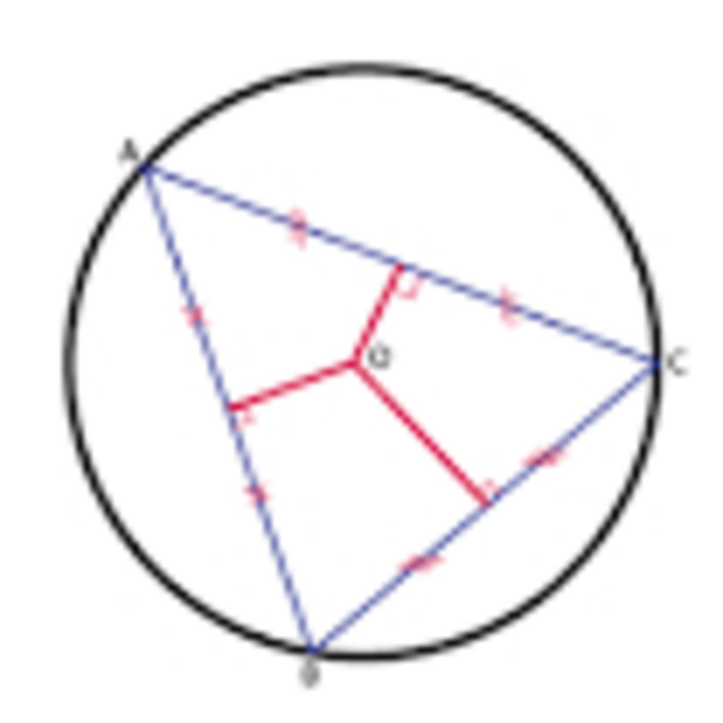 tính chất của đường tròn ngoại tiếp tam giác, tâm O của đường tròn ngoại tiếp tam giác sẽ là giao điểm của những đường thẳng vuông góc tại trung điểm (đường trung trực) của ba cạnh AB, AC và BC.