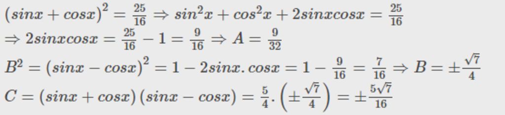 B2=(sinx−cosx)2=1−2sinx.cosx=1−916=716⇒B=±√74B2=(sinx−cosx)2=1−2sinx.cosx=1−916=716⇒B=±74