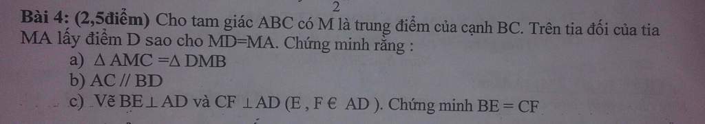 Đáp án: a/ vì M là trung điểm của BC (gt) ⇒ BM=MC ( tính chất trung điểm) Xét ΔAMC và ΔDMB, có AM=MD (gt) góc AMD = góc BMD ( 2 góc đối đỉnh) BM=MC (chứng minh trên) ⇒ ΔAMC = ΔDMB (c-g-c) b/ Vì ΔAMC = ΔDMB (chứng minh trên) ⇒ góc MAC = góc MDB ( 2 góc tương ứng) Mà 2 góc này nằm ở vị trí so le trong ⇒ AC // BD ( dhnb) c/ Vì BE vuông góc với AD (gt) ⇒ góc BEM = 90 độ Vì CF vuông góc với AD (gt) ⇒ góc CFM = 90 độ ⇒ góc BEM = góc CFM ( cùng = 90 độ) Xét ΔBEM và ΔCFM, có góc BEM = góc CFM = 90 độ (chứng minh trên) BM = CM ( chứng minh trên) góc BME = góc CMF ( 2 góc đối đỉnh) ⇒ ΔBEM = ΔCFM (ch-gn) ⇒ BE=CF ( 2 cạnh tương ứng) hương 7b Rút gọnĐáp án: a/ vì M là trung điểm của BC (gt) ⇒ BM=MC ( tính chất trung điểm) Xét ΔAMC và ΔDMB, có AM=MD (gt) góc AMD = góc BMD ( 2 góc đối đỉnh) BM=MC (chứng minh trên) ⇒ ΔAMC = ΔDMB (c-g-c) b/ Vì ΔAMC = ΔDMB (chứng minh trên) ⇒ góc MAC = góc MDB ( 2 gó... xem thêm