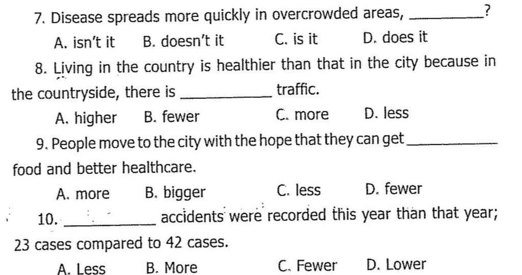 ( Giải thích : Vì traffic là danh từ ko đếm được vì vậy có thể loại fewer và higher đi , còn 2 đáp án more và less , nhưng theo logic thì đáp án phải là D vì thực tế ở nông thôn có ít xe chứ ko phải là nhiều )