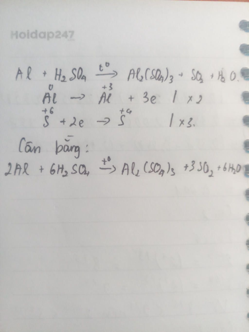 $2Al+6H_2SO_4(\text{đặc, nóng})\xrightarrow{{t^o}} Al_2(SO_4)_3+3SO_2+6H_2O$