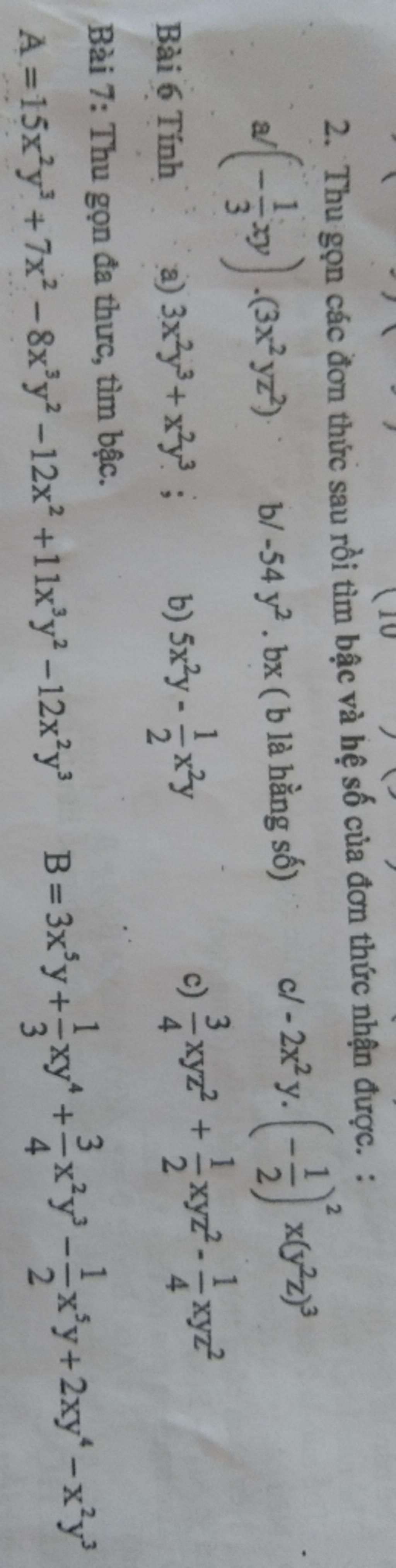 2. Thu gọn các đơn thức sau rồi tìm bậc và hệ số của đơn thức nhận được. :