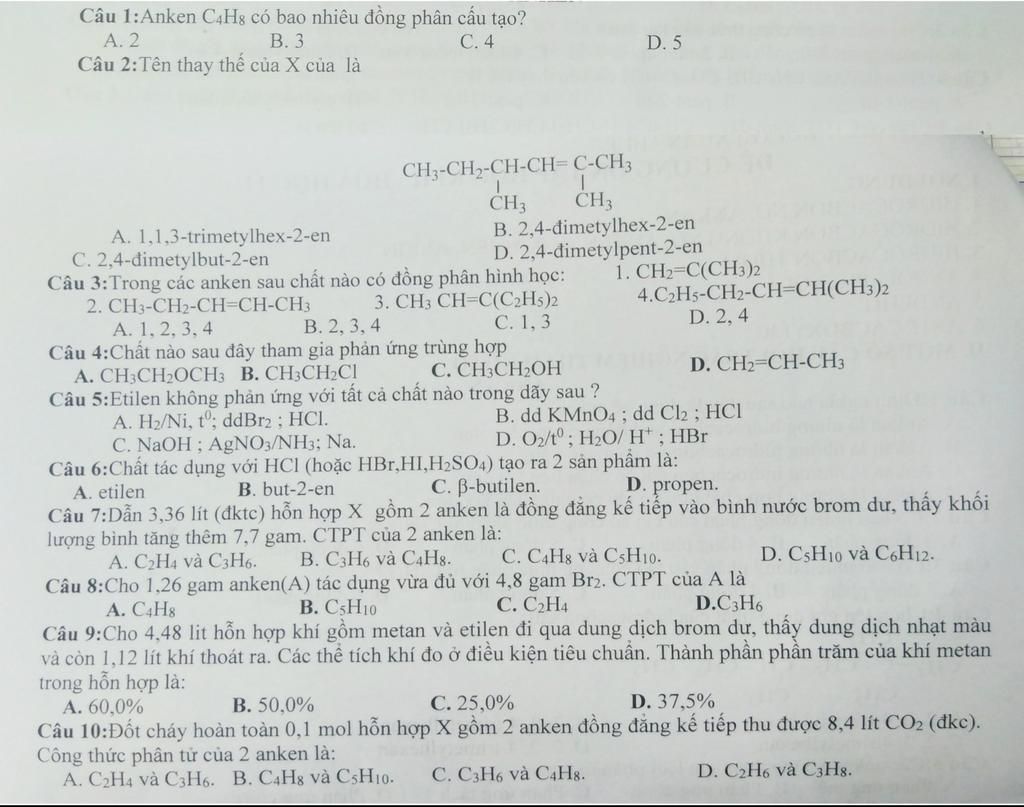 Câu 3:Trong các anken sau chất nào có đồng phân hình học: