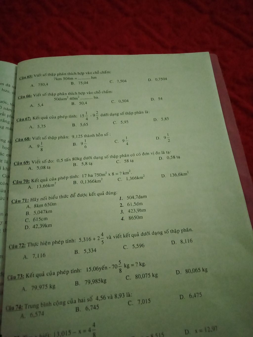 C65)\,\,7km\,504m = 70hm\, + \,5,04hm\, = 75,04hm\,\,\left( B \right)\\