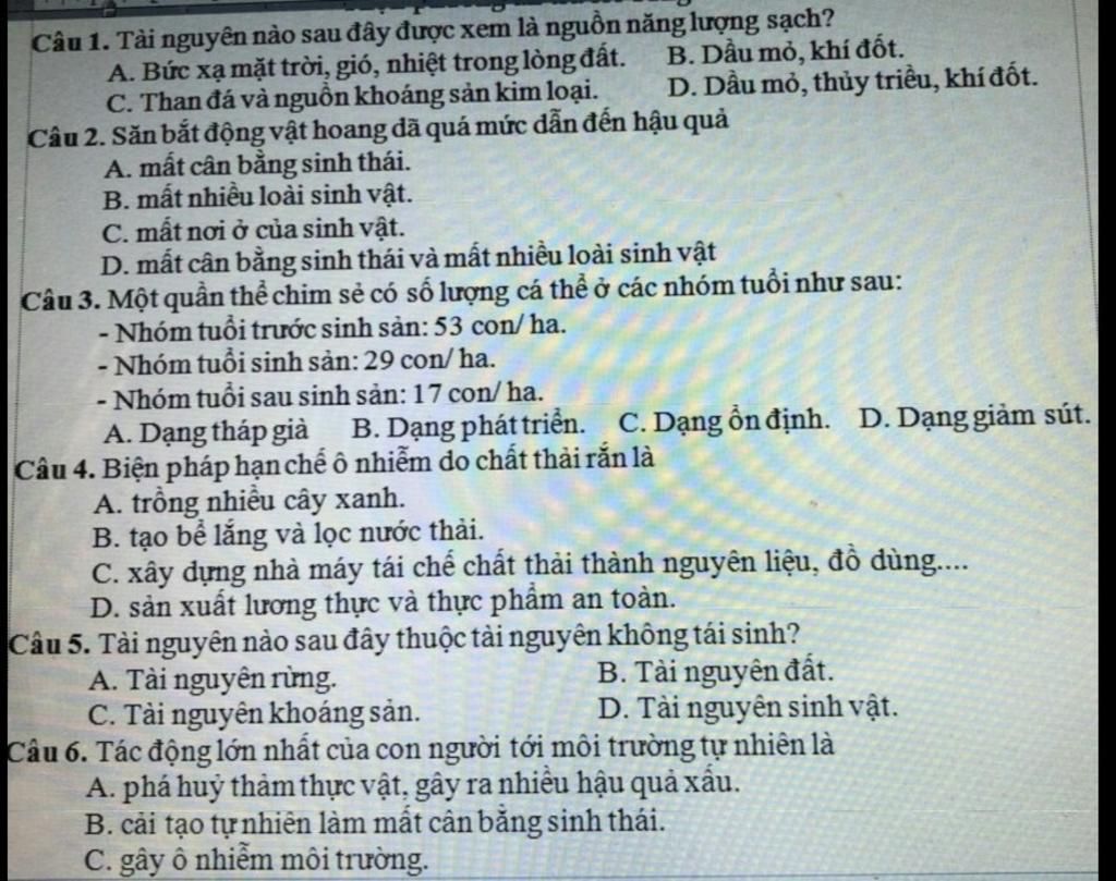 Câu 6: Tác động lớn nhất của con người tới môi trường tự nhiên là: