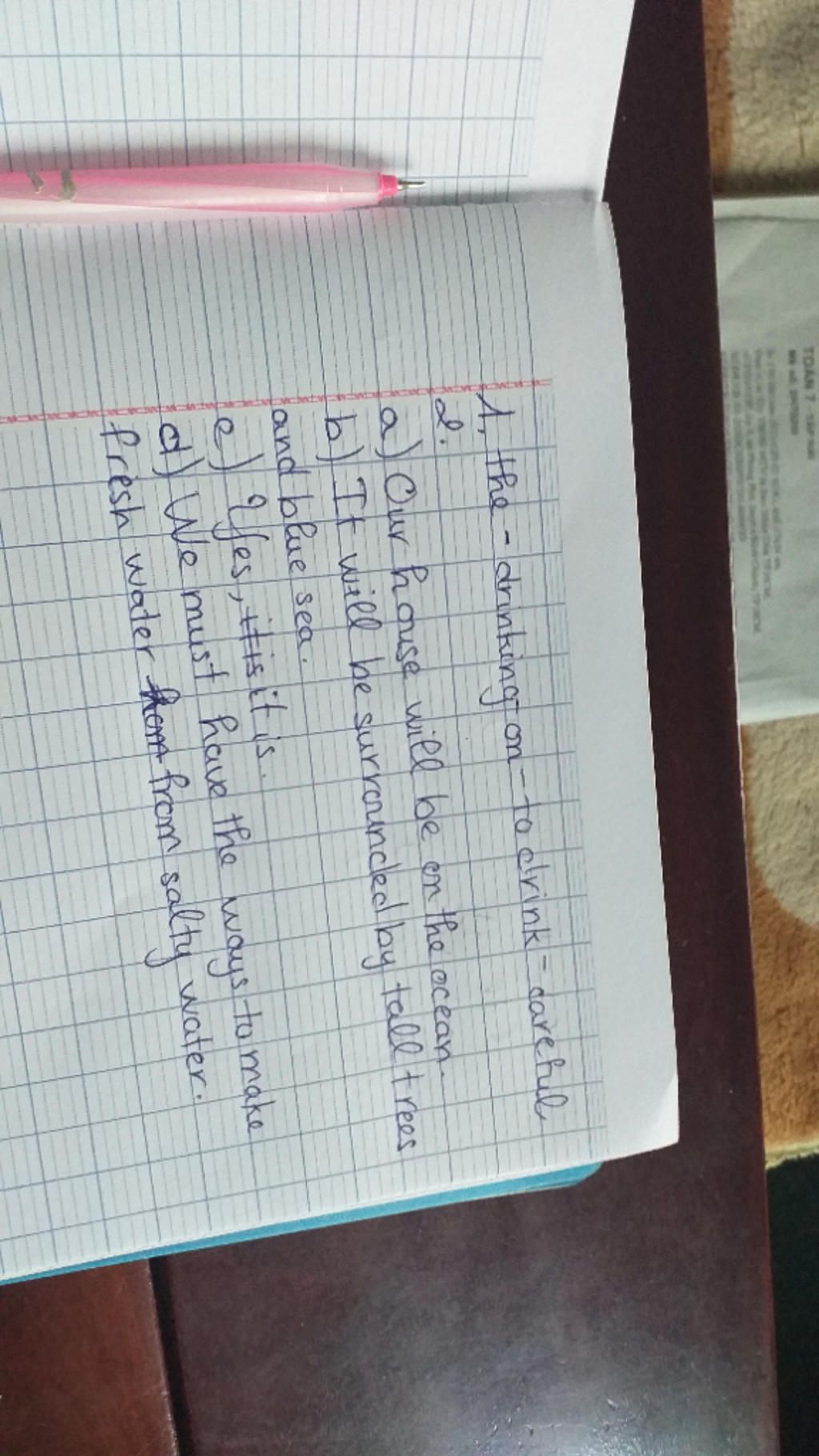 Our future house will be on ( a/an / the )ocean.it will be surrounded by tall trees and a blue sea. but we only have saltwater in the ocean.we need freshwater for ( drink/ drinking/ to drink/ to drinking) and for growing food( in / on /at/ in to) farms. Ocean water is too salty ( drink/ drinking/to drink / to drinking).it is also too salty for the watering plants. We must have the ways to make fresh water from salty water.we should be ( careful/ careless/ carefully/ carelessly) not to wastewater.
