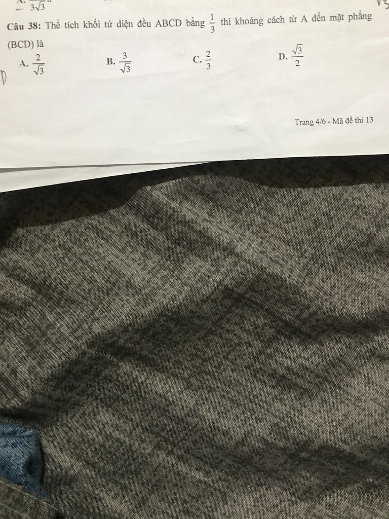 \Rightarrow h = \frac{{\sqrt 6 }}{3}x = \frac{{2\sqrt 3 }}{3} = \frac{2}{{\sqrt 3 }}