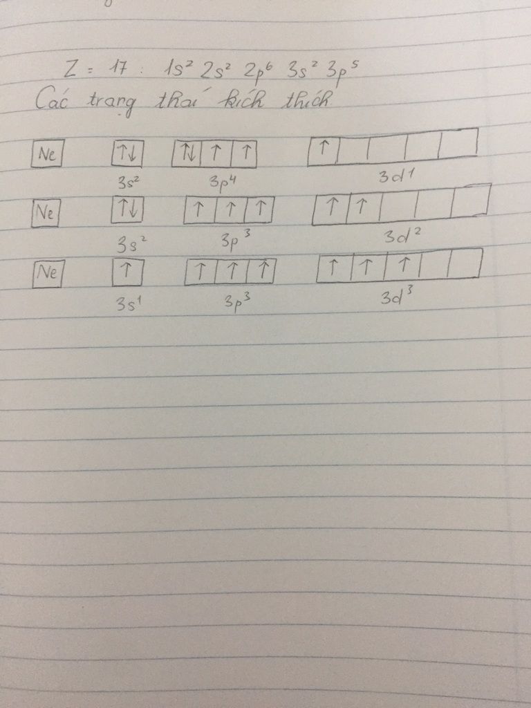 Cl cơ bản chỉ có 1e độc thân, do phân lớp ngoài cùng của Cl (3p) ở gần phân lớp 3d nên có thể kích thích lên các trạng thái kích thích có 3, 5, 7e độc thân, tương ứng với các cấu hình e: