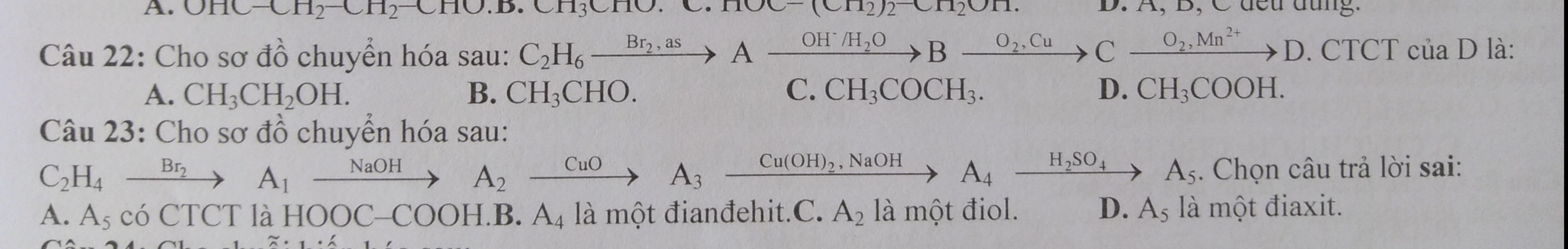 22.C2H6 -> CH3CH2Br-> CH3CH2OH -> CH3CHO -> CH3COOH .