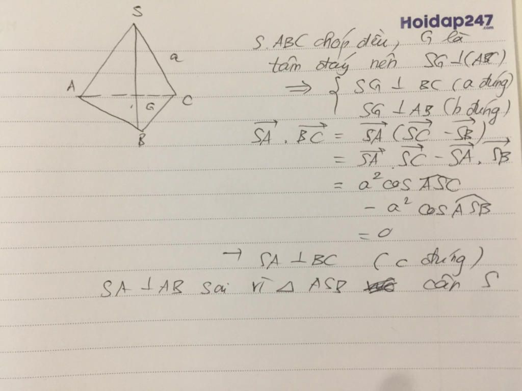 Do $S.ABC$ là chóp tam giác đều và $G$ là trọng tâm $ΔABC$ nên $SG⊥(ABC)$