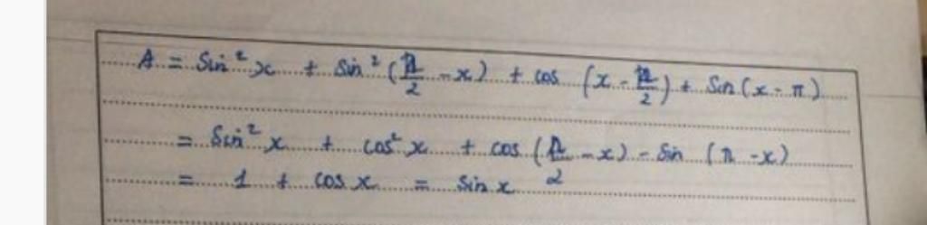 $\begin{array}{l} {\sin ^2}x + {\sin ^2}\left( {\dfrac{\pi }{2} - x} \right) + \cos \left( {x - \dfrac{\pi }{2}} \right) + \sin \left( {x - \pi } \right)\\ = {\sin ^2}x + {\cos ^2}x + \cos \left( {\dfrac{\pi }{2} - x} \right) - \sin \left( {\pi - x} \right)\\ = 1 + \sin x - \sin x = 1 \end{array}$