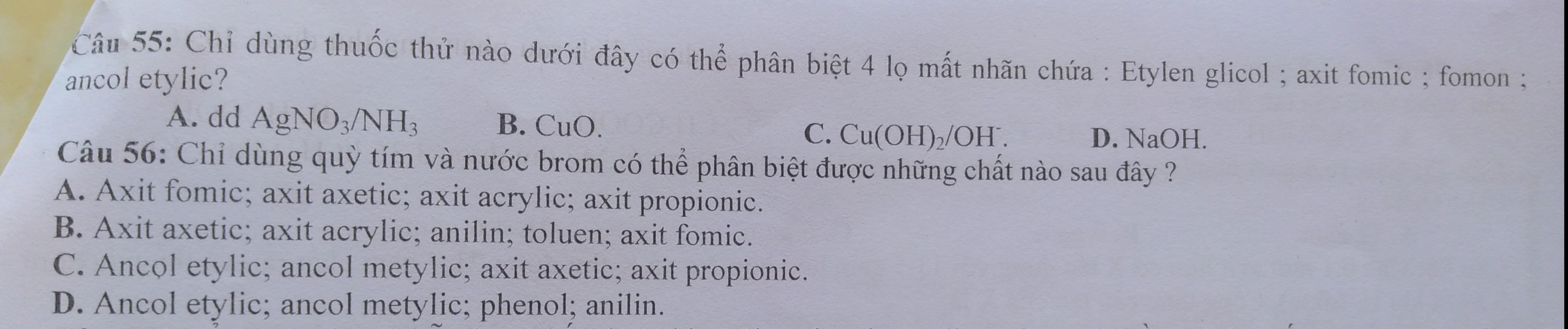 Câu 55: Chỉ dùng thuốc thử nào duới đây có thể phân biệt 4 lọ mất nhãn chứa : Etylen glicol ; axit fomic ; fomon :