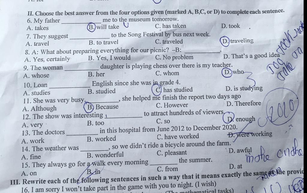 II. Choose the best answer from the four options given (marked A, B,C, or D) to complete each sentence.