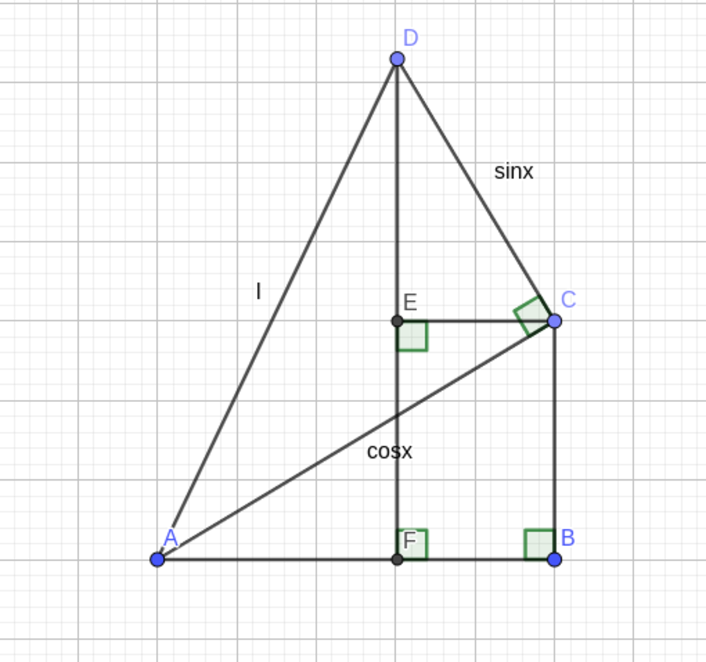 Mặt khác $\widehat{EDC}=\widehat{CAB}=y\rightarrow \cos y=\dfrac{DE}{DC}\rightarrow \cos y.DC=DE\rightarrow DE=\cos y.\sin x$