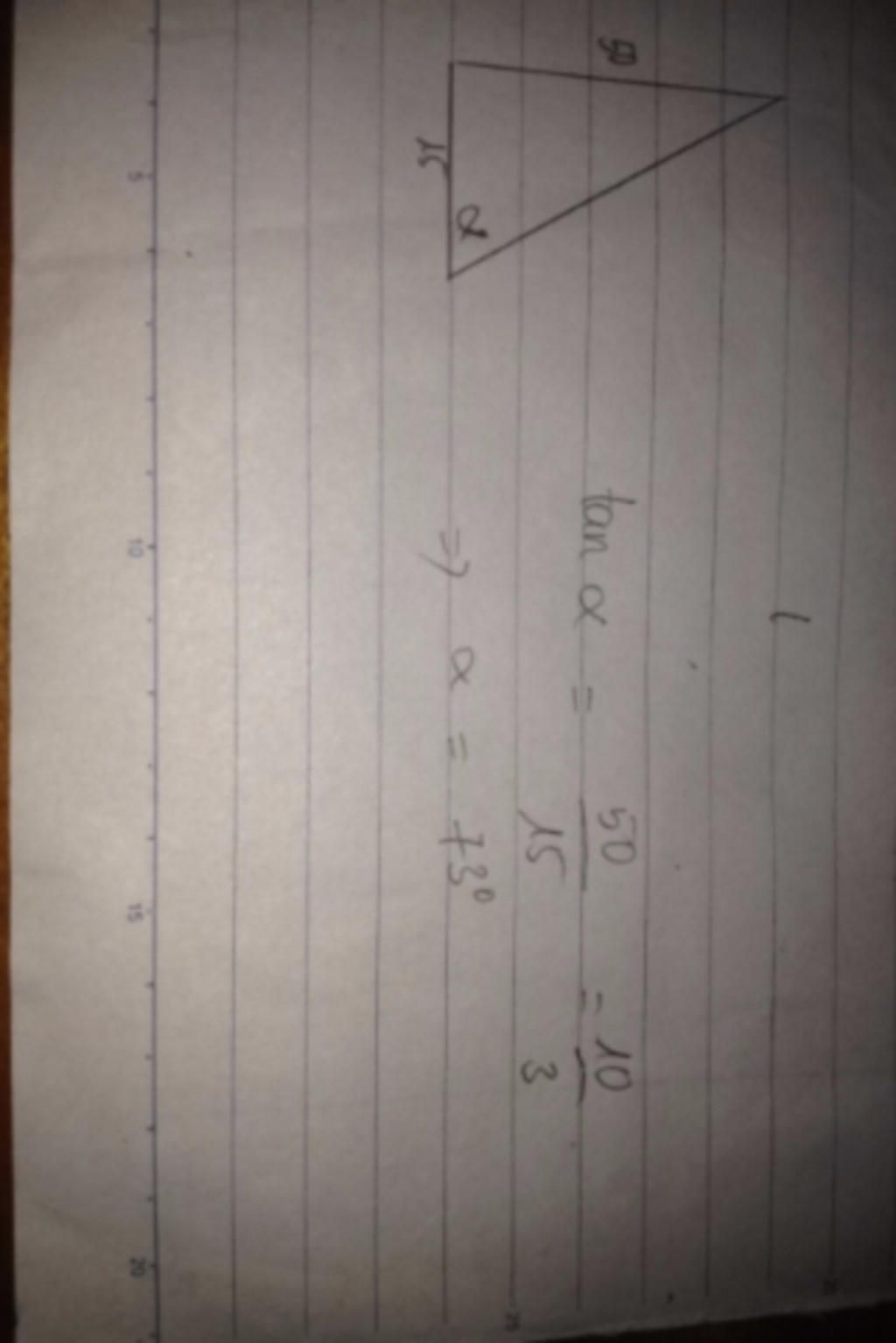 $\tan{\widehat{ACB}}=\dfrac{AB}{BC}=\dfrac{50}{15}=\dfrac{10}{3}$