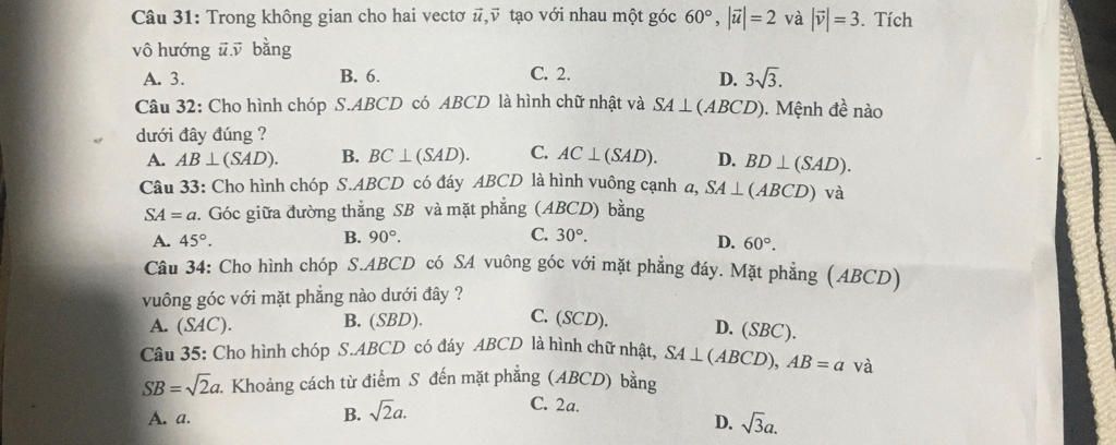 Ta có $tan \widehat{SBA}=\dfrac{SA}{AB}=\dfrac{a}{a}=1 \Rightarrow \widehat{SBA}=45^o \Rightarrow A$