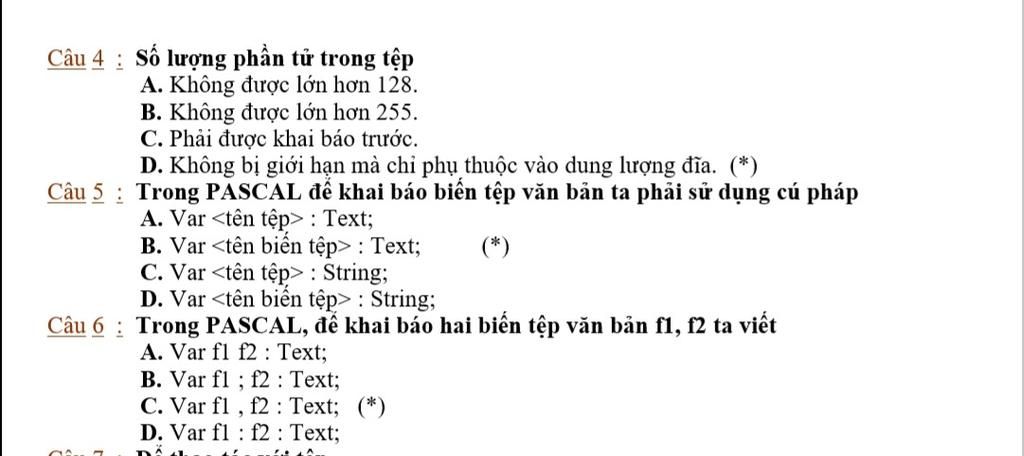 Trong PASCAL, để khai báo hai biến tệp văn bản f1, f2 ta viết Var f1, f2: Text;