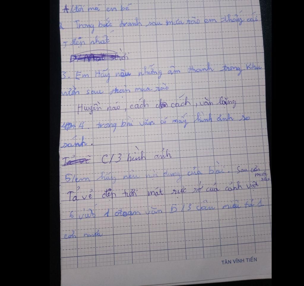 câu 6:vào mùa hè, bỗng dưng, những đám mây đen ù ù kéo đến. ôi! cơn mưa bắt đầu nổi lên. cơn gió thổi mạnh, làm ch cây cối rung mạnh. một lúc sau, mưa tạnh dần, mặt trời trở về tỏa nắng. thật mát mẻ làm sao!