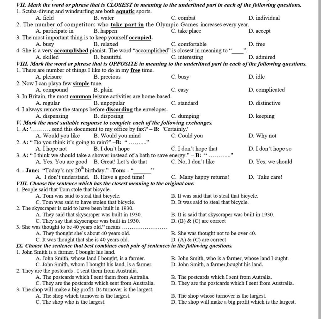 VII. Mark the word or phrase that is CLOSEST in meaning to the underlined part in each of the following questions.