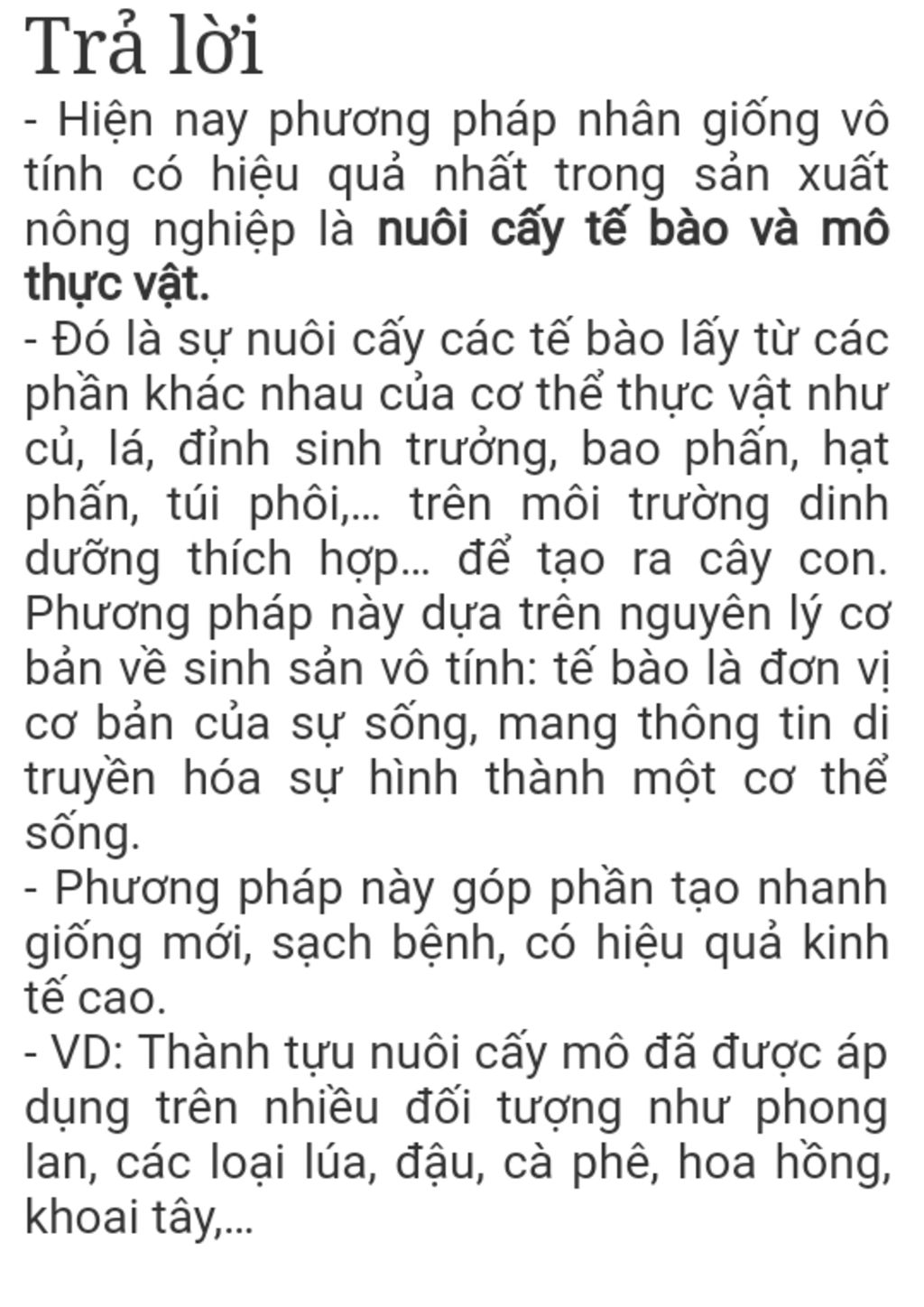 - Hiện nay phương pháp nhân giống vô tính có hiệu quả nhất trong sản xuất nông nghiệp là nuôi cấy tế bào và mô thực vật.