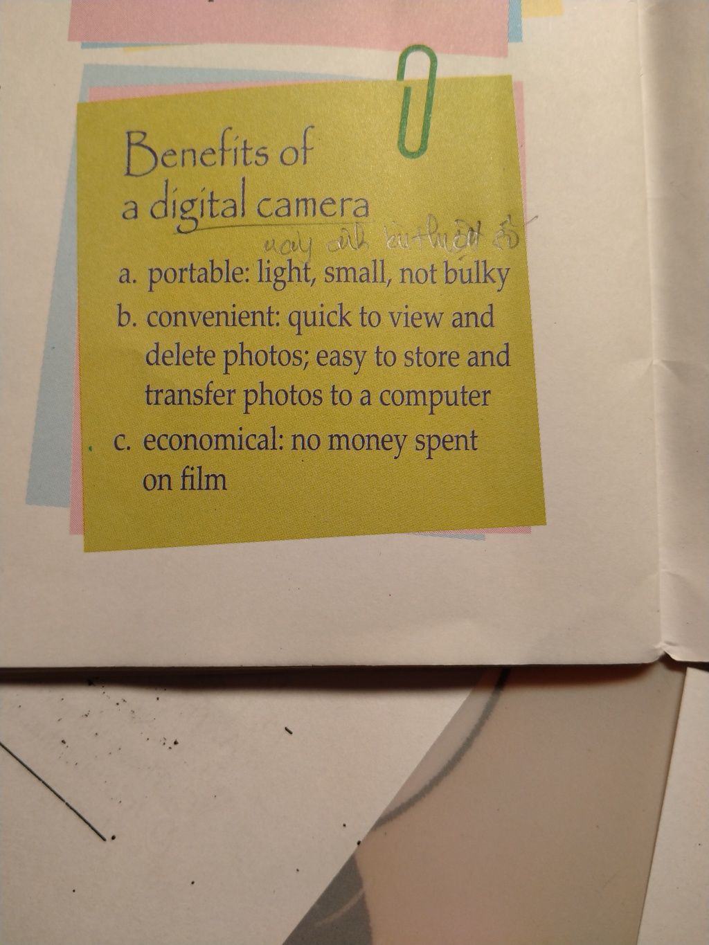 Máy ảnh kỹ thuật số đang trở nên càng ngày càng phổ biến. chúng ta có thể sử dụng no để chụp nhiều ảnh và lưu trữ những kỷ niệm khó quên. Những lợi ích của nó là gì? Đầu tiên máy ảnh kỹ thuật số thì có thể mang theo bên mình. Nó nhẹ và nhỏ nên dễ mang đi. Thứ hai, nó có nhiều chức năng hữu ích. Ví dụ, chúng ta có thể chụp ảnh và xem ảnh một cách nhanh chóng và nó cũng dễ dàng lưu trữ và truyền ảnh đến máy tính. Cuối cùng, máy ảnh kỹ thuật số tiết kiệm nhiều tiền nên chúng ta không phải dành tiền vào mua phim.