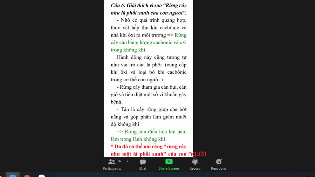 ⇒ Nhờ hoạt động quang hợp của cây xanh mà rừng cây giống như một lá phổi: nó có thể hấp thụ lượng CO2 khổng lồ để thải ra O2 cân bằng lại không khí.