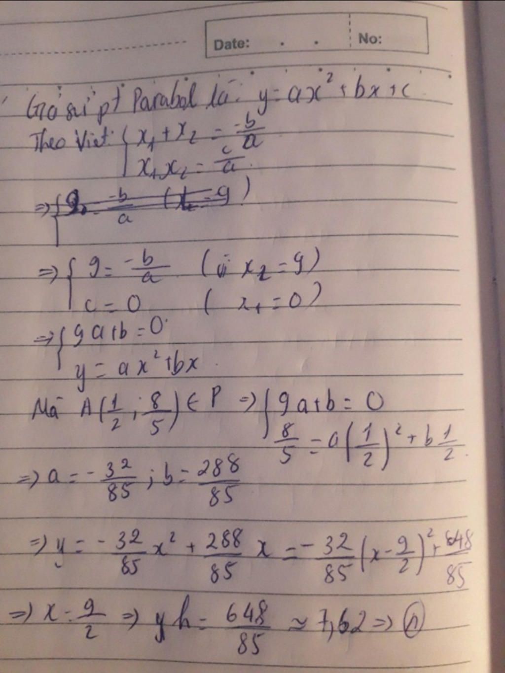 . Cổng Parabol của trường Đại học Bách Khoa Hà Nội được xây dựng cách đây khoảng 50 năm và đã từng là niềm tự hào của tri thức thế hệ mới.Để đo chiều cao (khoảng cách từ đỉnh đến mặt đất) của cổng Parabol, một người tiến hành đo khoảng cách giữa hai chân cổng được Người này thấy rằng nếu đứng cách chân cổng (gần nhất) thì đầu chạm cổng, biết người này cao . Tính chiều cao của cổng Parabol.