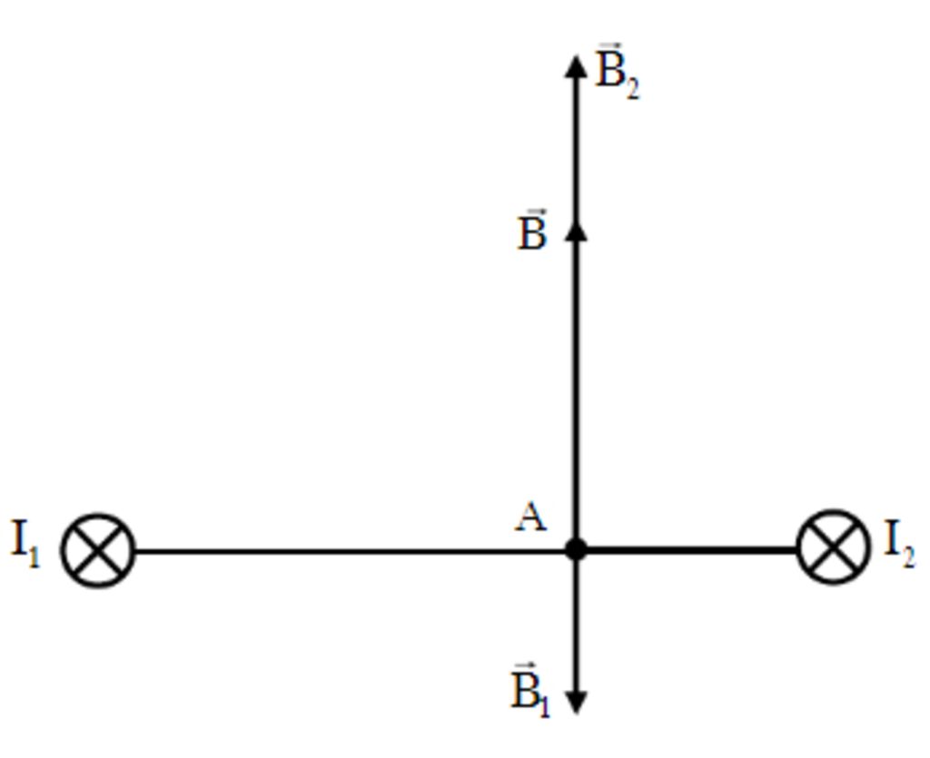 tại M cảm ứng từ của 2 dòng điện gây ra cùng phương, ngược chiều nên cảm ứng từ tổng hợp tại M