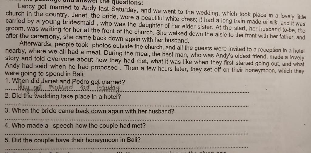 2. No, it didn't. (....to the wedding, which took place in a lovely little church in the country)