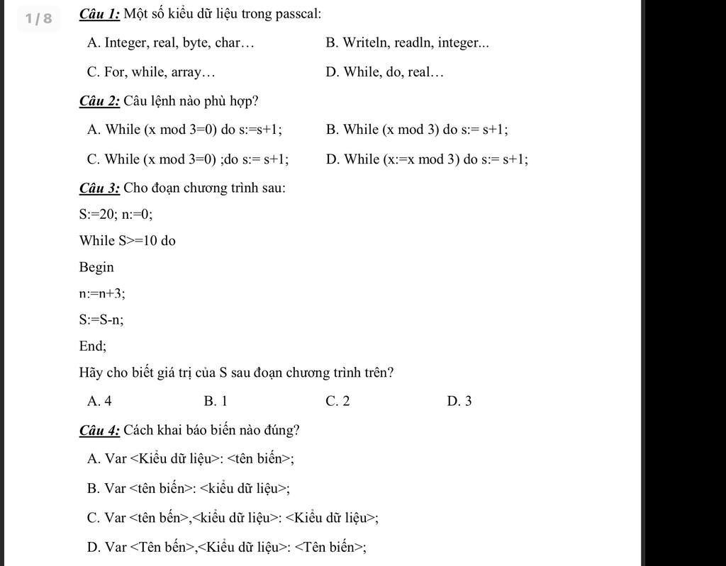 Câu 1: Một số kiểu dữ liệu trong passcal: