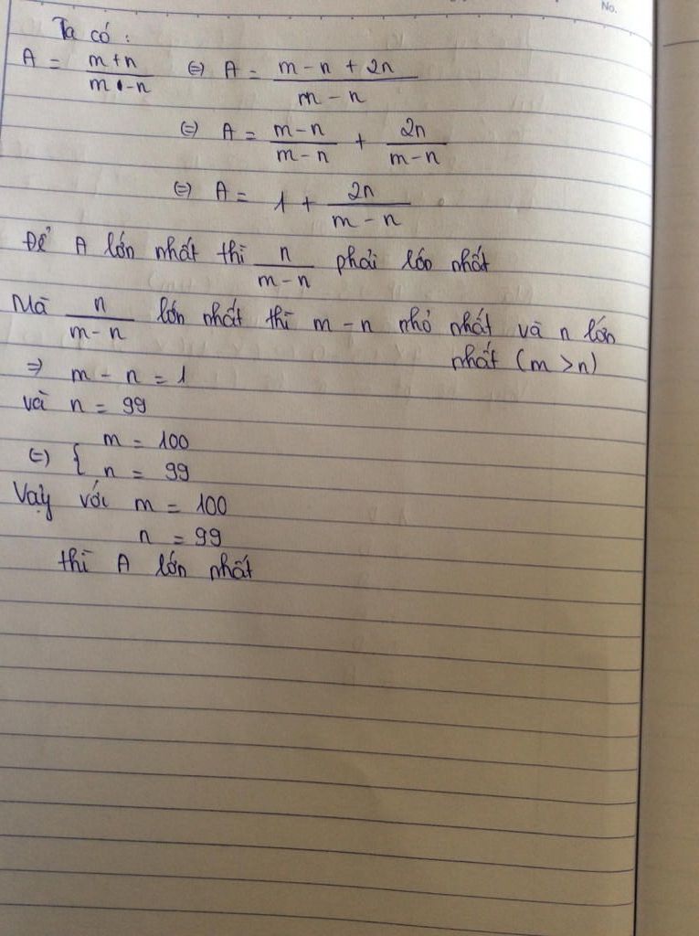 Để `A` là số lớn nhất thì `m + n` cũng phải là số lớn nhất .