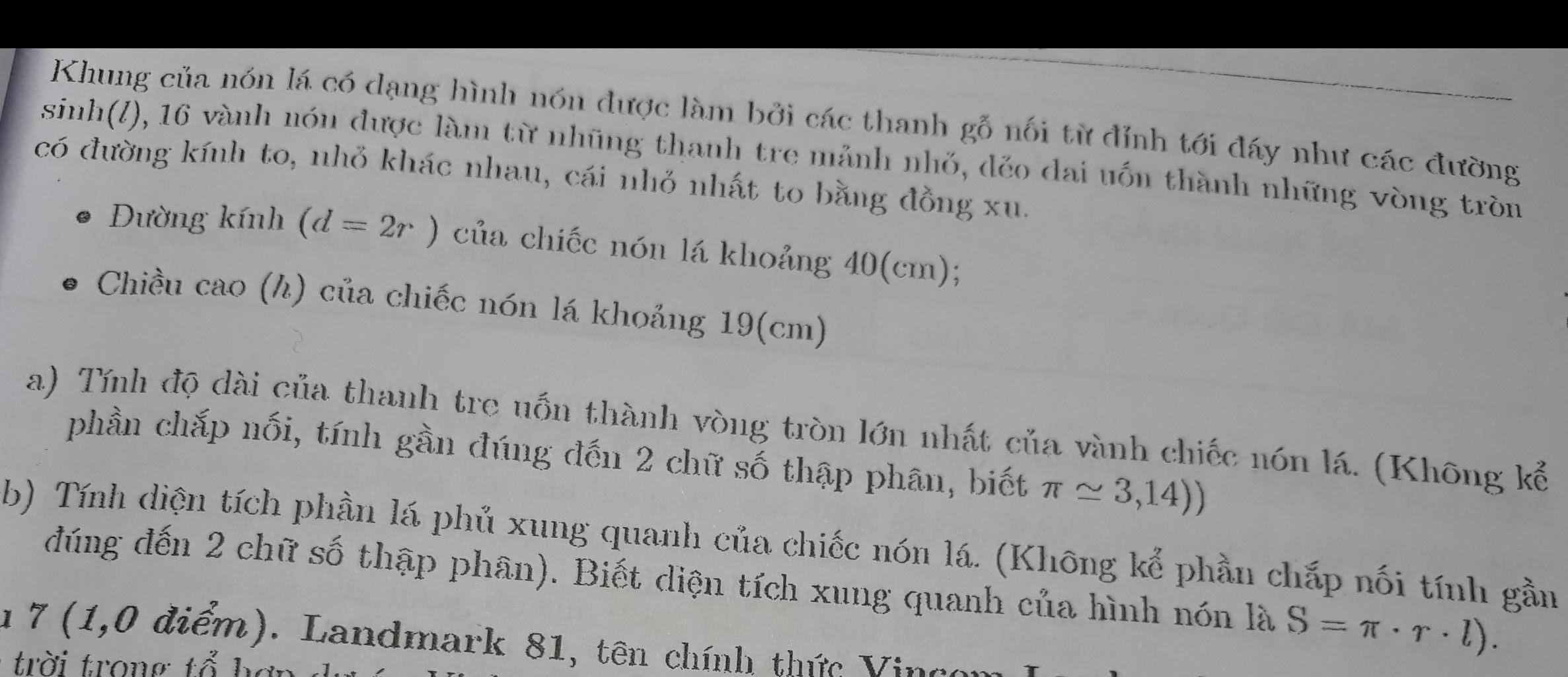 $S_{\text{lá}}=S_{\rm xq}=rl\pi=20.\sqrt{761}\pi\approx 1733,29(cm^2)$
