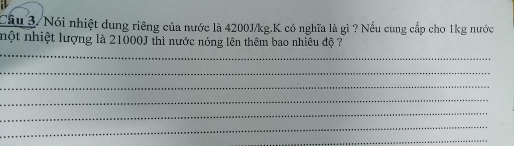 _ Nói nhiệt dung riêng của nước là 4200J/kg.K nghĩa là để làm cho 1kg nước tăng thêm 1°C thì ta phải cung cấp 1 nhiệt lượng là 4200J.