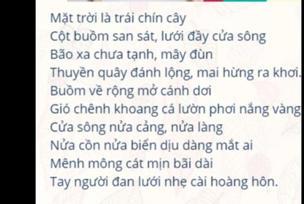 ND: sự cảm nhận của tác giả về miền quê nơi bốn bề sông nước, sự hồi tưởng lại những hình ảnh đẹp đẽ nơi của biển và tình yêu thiên nhiên thơ mộng của ông