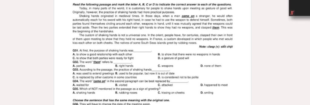 31. B to show that there were no weaponds in hands 32. C weaponds 33. C is replaced by other customs in some countries 34. D attacked 35. B rubbing noses