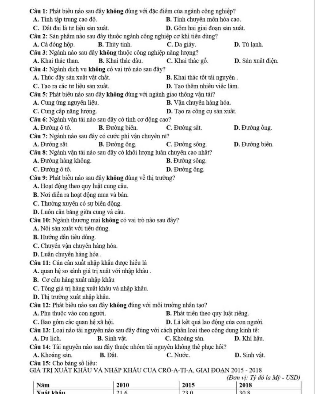 Câu 1: Phát biểu nào sau đây không đúng với đặc điểm của ngành công nghiệp?
