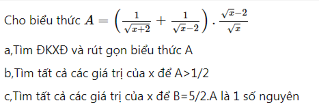 A = \left( {\frac{1}{{\sqrt x + 2}} + \frac{1}{{\sqrt {x - 2} }}} \right).\frac{{\sqrt x - 2}}{{\sqrt x }}\\