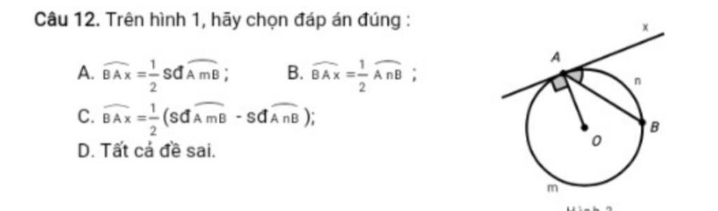B đúng vì đó là góc tạo bởi tiếp tuyến và dây cung, có số đo bằng nửa cung bị chắn