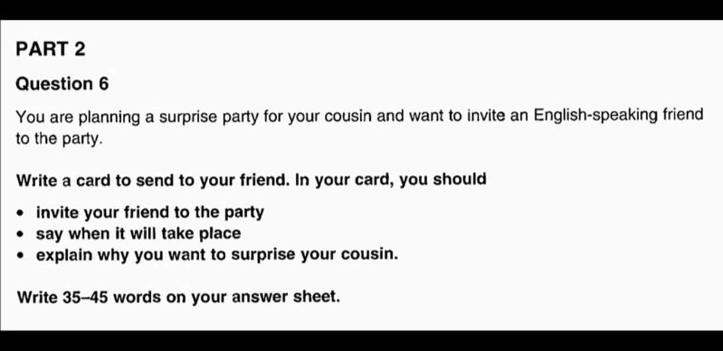 Dear friend,Do you know next Thursday will be a day of eager anticipation to me? It is then the day before my cousin fourteenth birthday. I have been looking forward to the party for at least two months. Everything is supposed to be perfect for that day: balloons, candles and tasty dishes, and music. There will be a barbeque of magnificent proportions. Miraculously, an enormous ice cream cake will be delivered with eight large pepperoni pizzas. Needless to say, Iam excited. It is to be my first party at our new house.I'm looking forward to seeing you come, that'll bring more life to this special event of my cousin.Best wishes,Thuy trang.