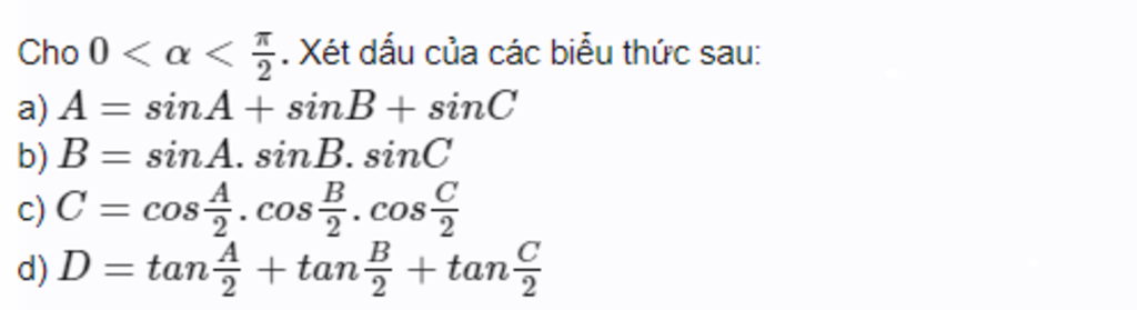 Ta có: \(0 < \,\,\angle A,\,\,\angle B,\,\,\angle C < \frac{\pi }{2} \Rightarrow \left\{ \begin{array}{l}\sin A > 0\\\sin B > 0\\\sin C > 0\end{array} \right. \Rightarrow A > 0.\)