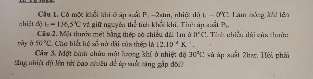 \(\dfrac{{{p_1}}}{{{T_1}}} = \dfrac{{{p_2}}}{{{T_2}}} \Rightarrow \dfrac{2}{{0 + 273}} = \dfrac{{{p_2}}}{{136,5 + 273}} \Rightarrow {p_2} = 3atm\)