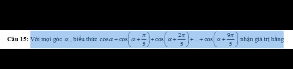 $ A = \cos \alpha + \cos \left( {\alpha + \dfrac{\pi }{5}} \right) + \cos \left( {a + \dfrac{{2\pi }}{5}} \right) + ... + \cos \left( {\alpha + \dfrac{{9\pi }}{5}} \right)\\ A = \left( {\cos \left( {a + \dfrac{\pi }{5}} \right) + \cos \left( {\alpha + \dfrac{{6\pi }}{5}} \right)} \right) + \left( {\cos \left( {\alpha + \dfrac{{2\pi }}{5}} \right) + \cos \left( {\alpha + \dfrac{{7\pi }}{5}} \right)} \right) + .... + \left( {\cos \left( {\alpha + \dfrac{{4\pi }}{5}} \right) + \cos \left( {\alpha + \dfrac{{9\pi }}{5}} \right)} \right) + \cos \left( {\alpha + \dfrac{{5\pi }}{5}} \right)\\ A = \cos \alpha + \left( {\cos \left( {a + \dfrac{\pi }{5}} \right) - \cos \left( {\alpha + \dfrac{\pi }{5}} \right)} \right) + \left( {\cos \left( {\alpha + \dfrac{{2\pi }}{5}} \right) - \cos \left( {\alpha + \dfrac{{2\pi }}{5}} \right)} \right) + ... + \left( {\cos \left( {\alpha + \dfrac{{4\pi }}{5}} \right) - \cos \left( {\alpha + \dfrac{{4\pi }}{5}} \right)} \right) - \cos \alpha \\ A = 0 $