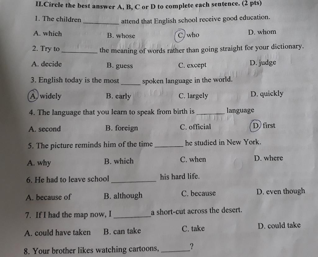 II.Circle the best answer A. B. Cor D to complete each sentence. (2 pts)