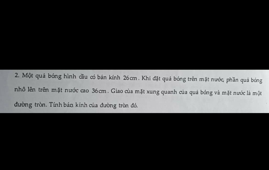 $\displaystyle \begin{array}{{>{\displaystyle}l}} Ta\ có:\ IA=IB=R=26\ cm\\ BH=36\ cm\\ \Rightarrow HI=26-36=-10< 0\ ( vô\ lí)\\ \Rightarrow Sửa\ BH=3,6\ cm\\ \ \Rightarrow IH=22,4\ cm\\ Vậy\ r=\sqrt{R^{2} -HI^{2}} =13,2\ cm \end{array}$