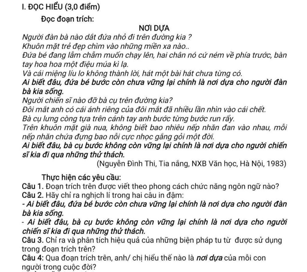 Câu 2. Nghịch lí trong hai câu in đậm của văn bản: Thông thường người yếu đuối tìm nơi dựa ở người vững mạnh. Ở đây ngược lại. Người mẹ trẻ khỏe dựa vào đứa con mới biết đi chập chững. Anh bộ đội dạn dày chiến trận dựa vào cụ già bước từng bước run rẩy trên đường.