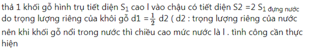 Lúc đầu vật nổi lên một nửa nên lực đẩy Ác si mét: \({F_{A1}} = {d_2}{S_1}.\frac{l}{2}\)